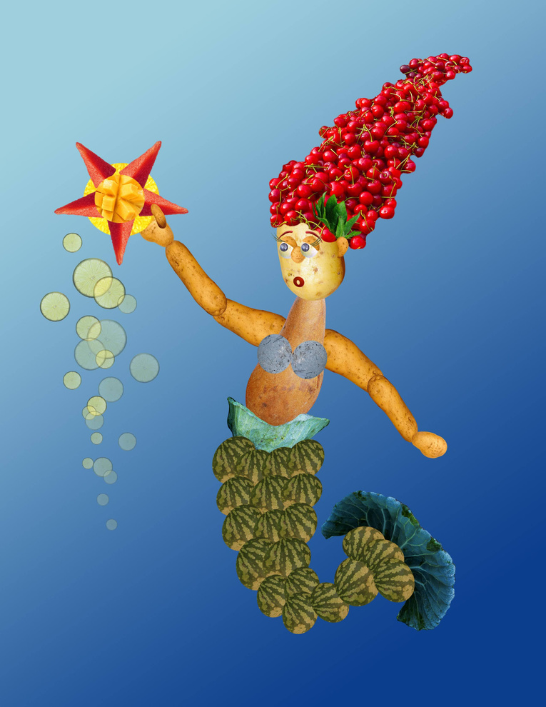 Design a character using only pictures of fruits and vegetables. This is Sapphira, Ariel's long-lost Greek cousin who lives in the Mediterranean Sea.